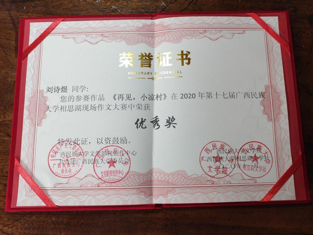 据悉,此次现场作文大赛以“距离”为主题,进行线上投稿,大赛共收到来自区内38所高校的稿件4221份,经四轮评审,评选出48篇获奖作品,其中一等奖2篇,二等奖6篇,三等奖15篇,以及优秀奖25篇。我校梁青同学的小说《风走了八千里》获得了三等奖,吴金玉同学的散文《好在有距离》和刘诗煜同学的小说《再见,小凉村》获得了优秀奖。
