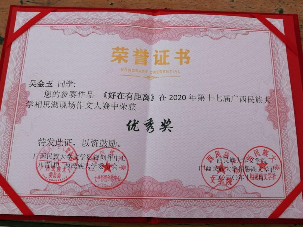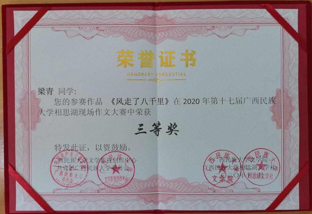 11月21日,第十七届广西民族大学“相思湖”现场作文大赛获奖名单揭晓,河池学院文传学院汉语言195班梁青、19汉语国际教育班吴金玉、汉语言173班刘诗煜3位同学在此次比赛中获奖。